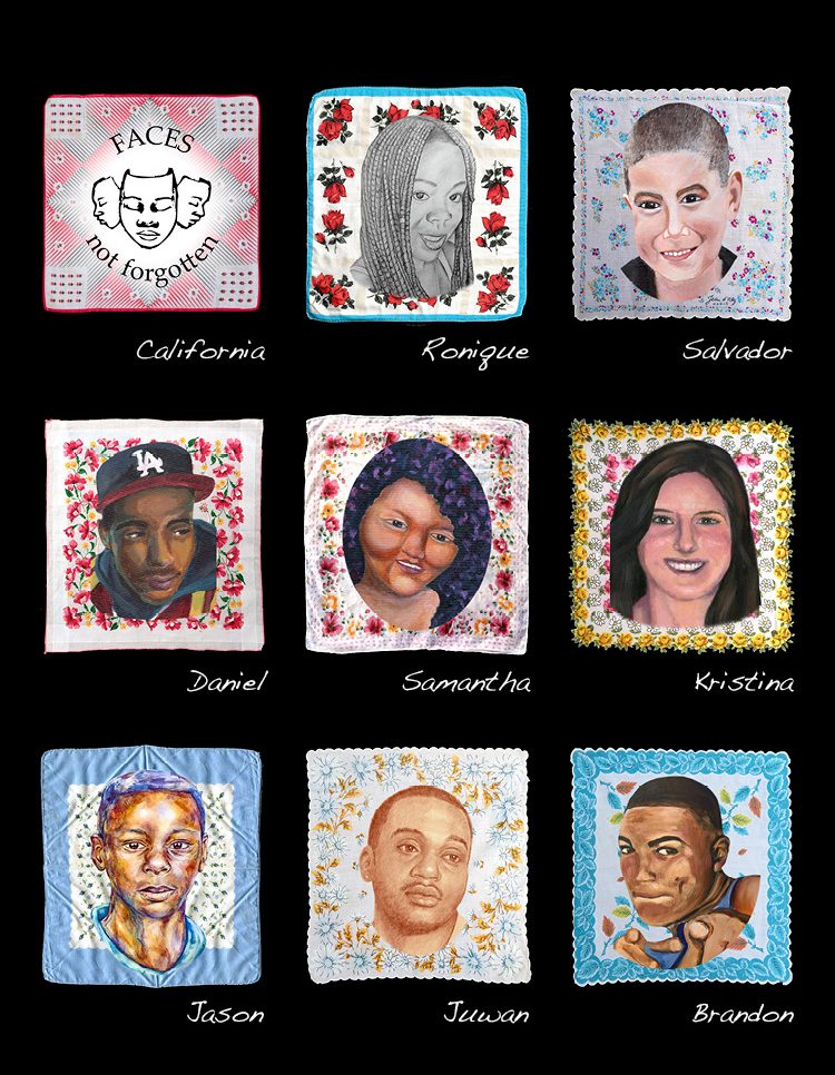Faces Not Forgotten paints the portraits of children, aged 20 and under, who have died as the result of gun violence, matching anonymous statistics to the specific faces they represent. To give comfort to the families of young gun violence victims, artists with the Faces Not Forgotten project hand-paint a portrait for each individual child lost to guns. The “Face” of each child is donated to the family, allowing them to grieve with the support of art. After the painting’s production and donation, an image of the original portrait is superimposed over an image of a vintage handkerchief and printed on canvas panels with grommets in the corners. These panels are tied together with black ribbon in sets of eight portraits, culminating in large-scale quilts, representing those eight children that have died from gun violence. These quilts are exhibited to the public to shift perception of the causes of gun violence and ignite change within local communities, urging the community to advocate for tighter gun legislation, as is so in nearly every other country globally (hence their substantially lower rates of gun violence compared to the U.S.). Additionally, Faces Not Forgotten features oral histories from family members of those memorialized by the quilt project to accompany the quilt installations, making the painful nation-wide issue impossible to ignore.