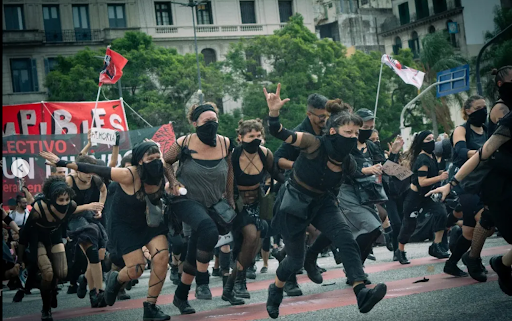 Fin de UN mundO is a movement of artists dedicated to supporting and creating interventions in public spaces with high-impact, highly-visible actions that draw on multiple artistic languages (performance, theatricality, dance, music, audiovisual, and more). There is not a single aspect of organizing that Fin de UN mundO doesn’t cover. In the collective’s WhatsApp group, political activists can find resources covering the basics of any artistic protest: how to make costumes, tips on make-up, assistance with hair, shoes… anything imaginable, for the sake of public interventions geared towards activist initiatives and artistic protest stratagies. If something is needed, especially for artistic and activist purposes, Fin de UN mundO finds a way to provide it, often via coalition building, mutual aid, and collaborative workshopping.