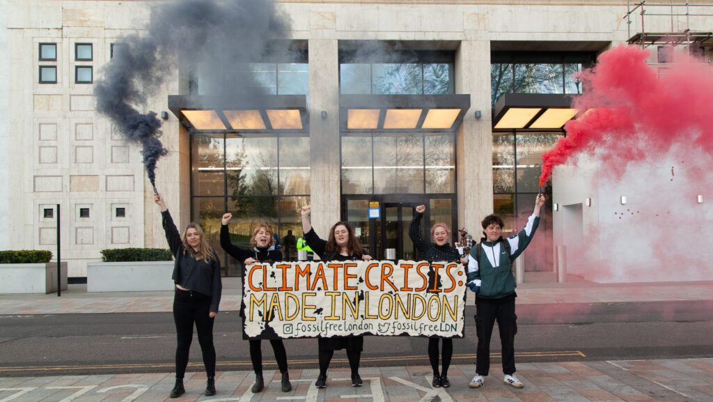 The campaign group uses direct action, creative stunts, disruption and protest to target key fossil fuel corporations and banks. They call for disengagement, divestment, and disclosure from universities and other socio-political and cultural institutions from companies contributing to the global climate crisis. Through poster-making sessions, large-scale marches and protests, and investigative research, Fossil Free London strives to free London from fossil fuel and its corporate backing.