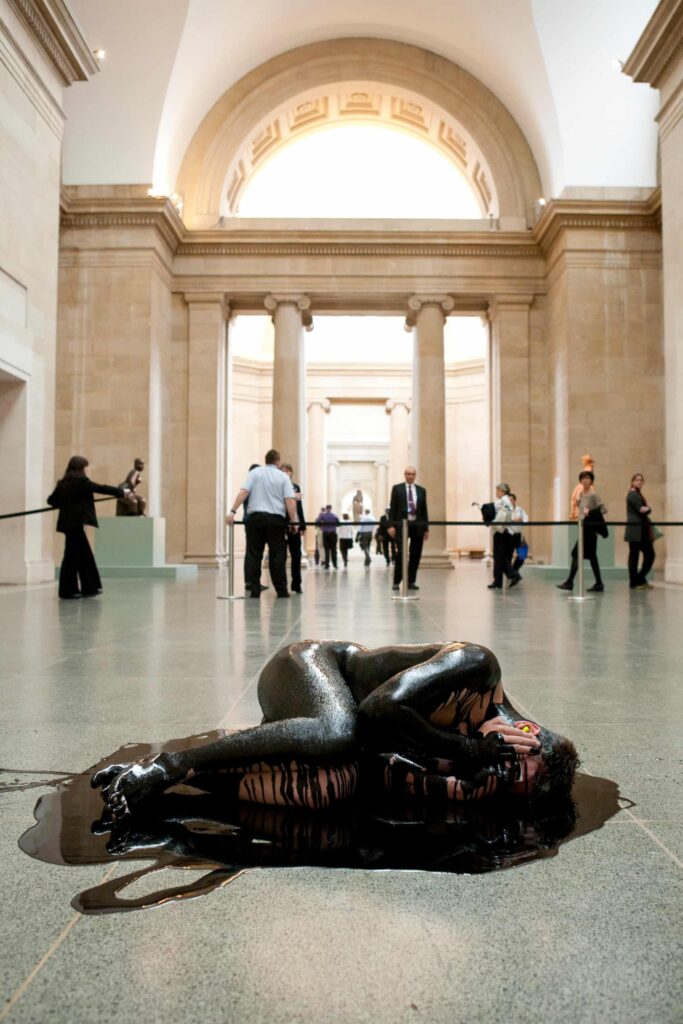 To convey their message, the collective staged unauthorized, site-specific performances within Tate galleries, blending art and activism to provoke public discourse and publicly pressure the institution in their own physical estate in London. The disruptive artistic strategy of Liberate Tate’s activist campaign rendered the issue of climate change and its capitalist-funding causes unavoidable for the museum’s visitors, putting pressure on the institution to end its ties to BP and other fossil fuel “giants.” Moreover, the highly visible and public nature of the group’s well-orchestrated stunts inside the museum (including a staged oil spill, the release of hundreds of black helium balloons attached to dead fish and birds, and the “offering” of a 1.5-tonne wind turbine blade to the museum’s collection) encouraged discourse on the wider influence of harmful funding streams and philanthropy in the fine arts.