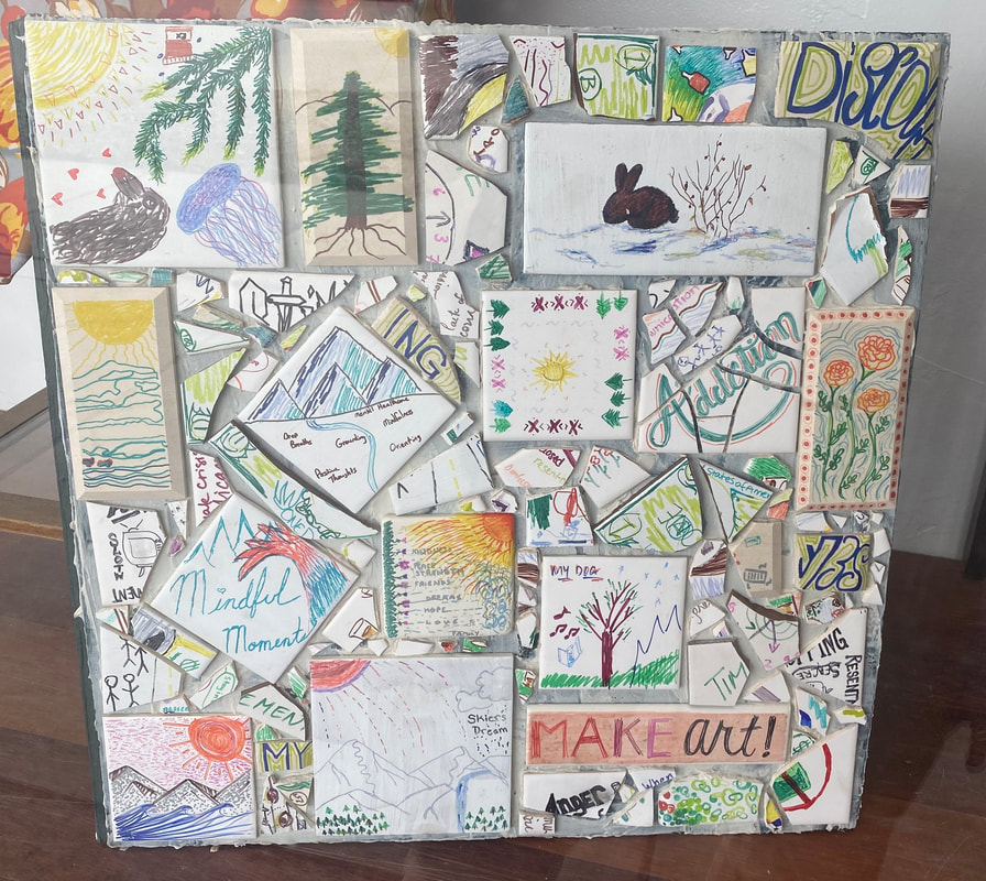 The Mental Health Mosaics project was created by Out North to express the complex and multifaceted factors that influence mental health, and to help break the stigma of talking about one’s mental health in the local context of Anchorage, Alaska. Community members were invited to decorate repurposed tiles with images and words representing the various influences on their personal mental well-being. Tiles symbolizing personal strengths were kept whole, while those representing challenges were intentionally broken, symbolizing the capacity to “break” free from one’s mental health challenges with time, strength, and community support. More than 120 people from across Anchorage contributed tiles, and volunteers from around the community helped construct the final pieces.